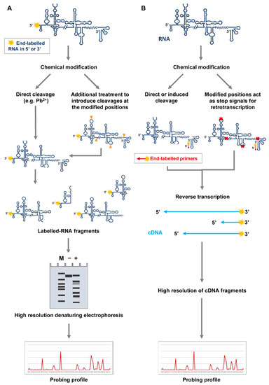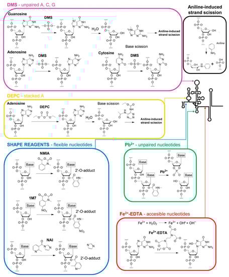 | Base-specific reagents give information on the paired/unpaired state of nucleotides. | Dimethyl sulfate (DMS) | Unpaired A (N1), C (N3) and G (N7) | Primer extension. For G (N7), reduction of modified RNA and aniline-induced strand scission is previously required. | X | X |