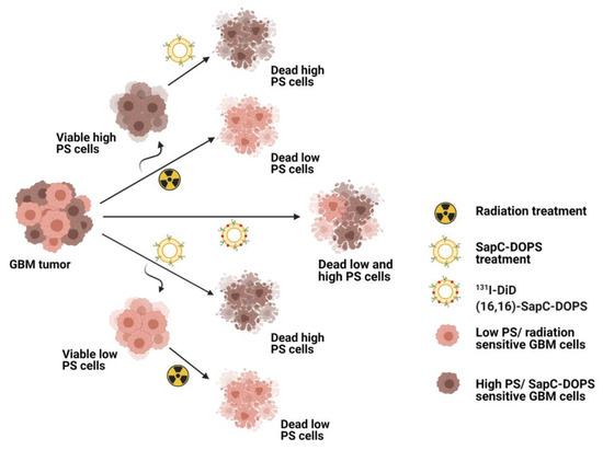 Tumors commonly display heterogeneous characteristics such as excessive surface PS exposure [73,85]. Most cancers have elevated surface PS exposure, but this shows variability even within the same tumor cell line [69]. It has been demonstrated that SapC–DOPS specifically targets cells with higher surface PS which are predominantly in the G2 cell phase, whereas radiation has a better effect on cells with lower surface PS cells are mainly in the G1 cell phase [28]. Similarly, TMZ arrests cells in the more susceptible G2/M cell-cycle phase and enhances the DNA-damaging effects of radiation [86]. Therefore, combining these two modalities should lead to enhanced tumor cell death (Figure 2).