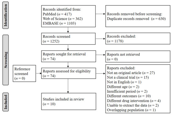 A detailed flow chart of the article selection process is presented in Figure 1. A total of 1882 articles were identified from searches of the three databases. After the removal of 630 duplicates, 1252 records were initially identified, of which the titles and abstracts were screened for inclusion. From this initial review, 74 articles were selected for full-text reviews and assessed for eligibility. Of these articles, 64 were excluded for the following reasons: not original research (n = 27), not a clinical trial (n = 15), not in English (n = 1), participants ineligible by age (n = 2), study duration less than 4 weeks (n = 2), ineligible outcomes (n = 10), ineligible drug interventions (n = 4), not amenable to data extraction (n = 2), and overlapping population (n = 1). Ultimately, 10 articles were selected for this systematic review [24,25,26,27,28,29,30,31,32,33].