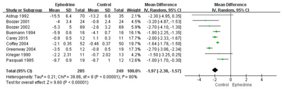 Nine studies with 534 patients were evaluated to investigate the weight loss effect of ephedrine-containing products in obese or overweight individuals. The weight mean difference (MD) between the ephedrine-containing product group and the placebo group was −1.97 kg (95% confidence interval (CI): −2.38, −1.57; p < 0.00001; I2 = 80%) (Figure 2). Neither Begg’s test nor Egger’s test revealed significant publication bias (Begg’s test: p = 0.677; Egger’s test: p = 0.356; Figure S1, Supplementary Materials).