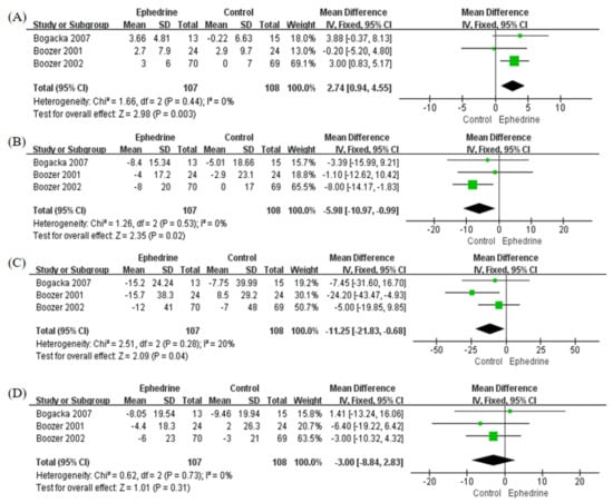 Three studies investigated the influence of ephedrine-containing products on high-density lipoprotein cholesterol (HDL-C), low-density lipoprotein cholesterol (LDL-C), triglyceride (TG), or total cholesterol (TC). The ephedrine-containing products group had a higher mean HDL-C concentration, with an MD of 2.74 mg/dL (95% CI: 0.94, 4.55; p = 0.003; I2 = 0%) (Figure 4A). Additionally, the ephedrine-containing product group had significantly lower mean concentrations of LDL-C (Figure 4B) and TG (Figure 4C) than the placebo group: the MDs were −5.98 mg/dL (95% CI: −10.97, −0.99; p = 0.02; I2 = 0%) and −11.25 mg/dL (95% CI: −21.83, −0.68; p = 0.04; I2 = 20%), respectively. In terms of TC, there was no significant intergroup difference, but the ephedrine-containing product group had a lower mean TC concentration (MD: −3.00; 95% CI: −8.84, 2.83; p = 0.31; I2 = 0%, Figure 4D). Neither Begg’s test nor Egger’s test showed significant publication bias in any of the lipid level analyses (Figure S3, Supplementary Materials).