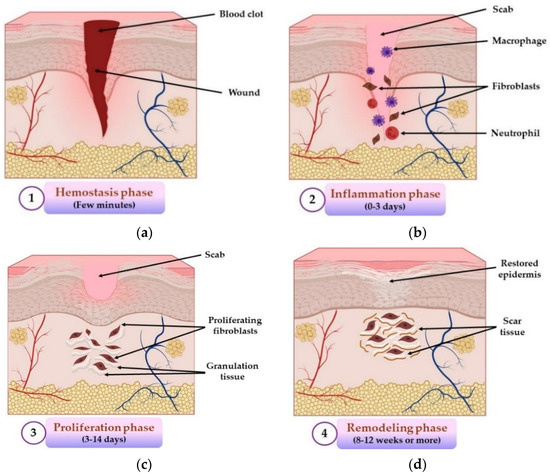 The four stages of wound healing process: (a) hemostasis phase; (b) inflammation phase; (c) proliferation phase; (d) remodeling phase. All illustrations have been created with BioRender.com, Inkscape, and PowerPoint.