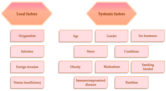 Many factors can interfere with the wound-healing phases, the consequence being an improper or damaged wound repair process. In general, these factors can be categorized as local and systemic. Local factors affect features of the lesion itself, and systemic factors represent the general health or condition states of one person, which influence the capacity to heal [56]. The main factors that affect the wound-healing process are presented in Figure 2.