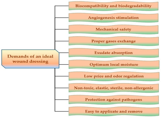 For the development of dressings, which allow rapid healing, with minimal scars on the body surface, it is necessary to develop new biopolymeric materials that accomplish some properties to create the ideal wound dressing that are reviewed in Figure 3.