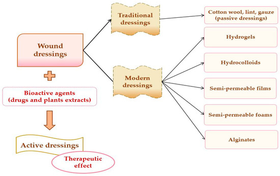 A potential classification of wound dressings comprises passive dressings and active dressings, depending on the presence or absence of one or more pharmacologically active substances or natural substances [82], which can act to the site of the lesion, with local or systemic action, conditioned by the depth of the wound. Moreover, the progress of manufacturing led to the evolution of wound dressings from traditional dressings to modern (advanced) dressings [83].