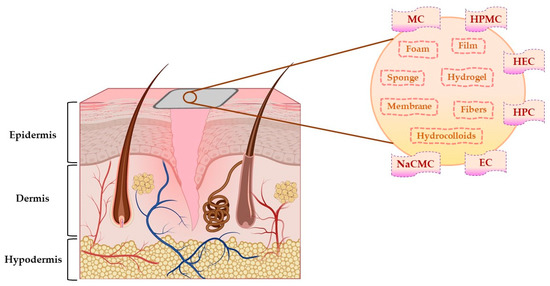 Due to the general properties of wound dressings presented in Section 4.1, but also the particular properties, such as hydrophilicity, mechanical toughness, pH stability, and rheological characteristics, cellulose and cellulose derivatives have multiple applications in many fields [134]. Areas of the applicability of all these biopolymers involve: biomedical and pharmaceutical industries, where they can act as drug-delivery devices, wound dressings, muco- and bioadhesive drugs, excipients for drug formulations, and support for tissue engineering [29]; also, they can be used for cosmetic and hygienic products, in the textile area, in the food industry and agriculture [128,135]. The representation of cellulose derivatives-based wound dressing on an open wound is illustrated in Figure 6.