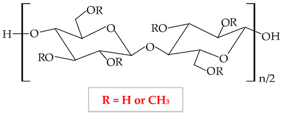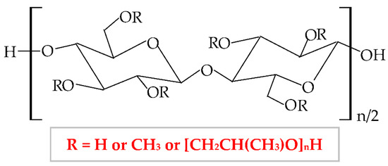 Methylcellulose (MC) is a semi-synthetic and non-ionic polymer, a cellulose ether derivative with high solubility in water, which is influenced by temperature [247]. It forms through the etherification of cellulose molecule with methyl chloride or dimethyl sulfate in basic solution [27] when the hydroxyl groups from the mother molecule are substituted with methyl groups, which leads to a diminishing of crystallinity [248]. The chemical structure of MC is presented in Figure 9.