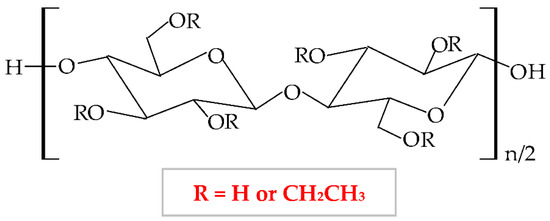 Cellulose, discovered by Anselme Payen in the 19th century, is a natural polymer, an organic polysaccharide from plant origin, non-toxic, with a structural role, being the most plentiful and renewable biopolymer on Earth [117]. Structurally, cellulose is a linear macromolecule composed of many molecules of D-glucose (the number of the glucose units can reach more than ten thousand), which are bound through 1-4-β-glycosidic linkages and its chemical formula is (C6H10O5)n [118]. The chemical structure of cellulose shows the presence of free hydroxyl groups at C2, C3, and C6 of each molecule of glucose, which have a good capacity to form powerful inter- and intramolecular hydrogen bonds [119]. As a result of this property, cellulose has a crystalline and stiff structure and, consequently, it is insoluble in water and the majority of the organic solvents; moreover, this natural biopolymer cannot be digested by the human digestive system [120,121]. Cellulose has good stability to pH fluctuations and temperature [122].