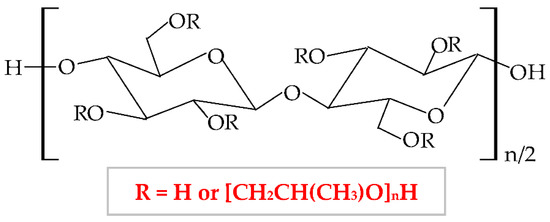 Hydroxypropylmethylcellulose (HPMC), hypromellose [187], is a semi-synthetic hydrophilic polymer, a nonionic cellulose ether derivative [188], with higher stability at a lower pH. In terms of physical properties, HPMC is a white, fibrous, or granular powder, whose particles are not cohesive, and it does not have a taste and odor [189]. This biopolymer results from hydroxyl groups substitution from cellulose molecule with methyl and hydroxypropyl groups. The chemical structure of HPMC is illustrated in Figure 8.