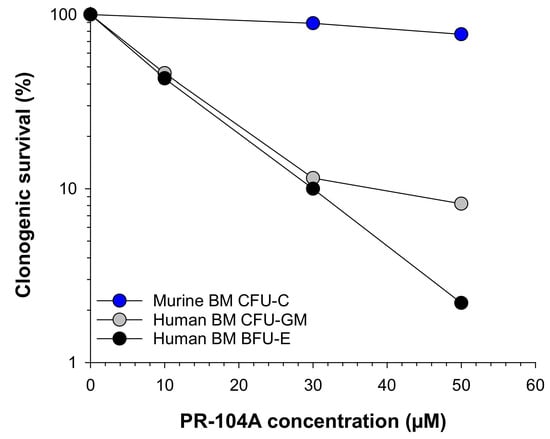 Bone marrow low-density cells harvested from the femori and tibiae of male C57BL/6 mice were isolated on a discontinuous density gradient (1.083 g/mL). Fresh human bone marrow cells (BMCs) were sourced from Lonza Bioscience (Houston, TX, USA). Primary BM progenitors were exposed to PR-104A (50 μM, 3.5 h) under aerobic conditions (37 °C, 5% CO2), washed and plated in MethoCult H4434 (human) or MethoCult M3434 (mouse) (Stem Cell Technologies, Cambridge, MA, USA) for two weeks’ growth with subsequent colony counting.