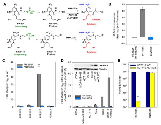 SN29176 is a novel PR-104A analogue that is resistant to aerobic bioactivation by human aldo-keto reductase 1C3 (AKR1C3). (A) Schematic of phosphate pre-prodrug PR-104 or SN35141 conversion to prodrug PR-104A and SN29176, respectively, with subsequent reduction to cytotoxic hydroxylamine and amine metabolites. (B) Recombinant human AKR1C3-enzyme-dependent consumption of co-factor NADPH upon incubation with PR-104A or SN29176. HI = heat inactivated. (C) Relative sensitivity of HCT116 cell lines expressing the AKR1C1-4 family members determined as the concentration of PR-104A or SN29176 required to inhibit cell growth by 50% compared to untreated controls following 4 h drug exposure and five days’ regrowth. Fold change in IC50 values indicates the ratio of the IC50 values between the untransfected (wild-type, WT) and AKR1C-expressing cell lines. (D) Relative sensitivity of cancer cell lines to aerobic exposure to PR-104A or SN29176 in the presence or absence of the potent, selective AKR1C3 inhibitor SN34037. Fold change in IC50 values indicates the ratio of the IC50 values in the presence and absence of inhibitor. Expression levels of AKR1C3 in the cell lines is determined by Western blotting (inset). (E) Average plating efficiency of HCT116 WT and HCT116 AKR1C3 cell lines following exposure to PR-104A or SN29176 (10 µM) at high cell density; * p < 0.001.