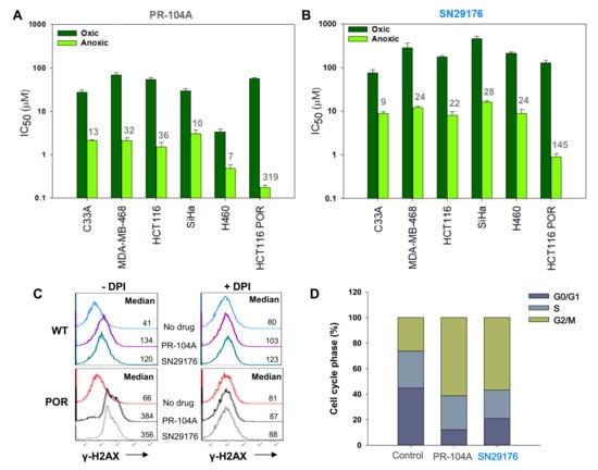 Conserved mechanism of action of SN29176 and PR-104A in vitro, with similar hypoxia selectivity and one-electron bioactivation to DNA-damaging species that induce cell cycle arrest. In vitro anti-proliferative activity of (A) PR-104A and (B) SN29176 in various cancer cell lines under aerobic and anoxic conditions. IC50 values were determined as the concentration of drug required to inhibit cell growth by 50% compared to untreated controls following 4 h drug exposure and five days’ regrowth (mean ± SD of three or more independent determinations). Numbers above the light green bars are the ratios of aerobic and anoxic conditions IC50 values (HCR = hypoxic cytotoxicity ratio). (C) Monitoring of DNA damage response in HCT116 WT and POR-expressing cells by immunocytochemical detection of γ-H2AX induction following PR-104A and SN29176 treatment under anoxia, with inhibition by diphenyleneiodonium (DPI), a suicide inhibitor of POR. (D) Change in cell cycle distribution in C33A cells following exposure to PR-104A or SN29176 at their respective IC50 values.