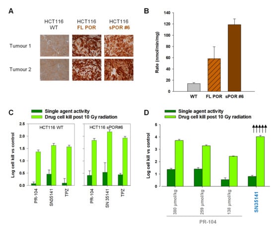 Evaluation of the therapeutic efficacy of SN35141, the water-soluble phosphate pre-prodrug of SN29176. (A) Detection of POR in xenografts of the clonal cell line sPOR#6 with representative immunohistochemistry. (B) NADPH-cytochrome C reduction assay on a clonal cell line of HCT116 generated to homogeneously overexpress a soluble version of POR in xenografts in which the endoplasmic reticulum membrane anchor has been deleted (sPOR#6). FL = full length POR. (C) Clonogenic cell kill of HCT116 WT and HCT116 sPOR#6 xenografts 18 h after treatment with hypoxia-activated prodrugs PR-104 (380 µmol/kg, i.p.), SN35141 (1330 µmol/kg, i.p.) or tirapazamine (178 µmol/kg, i.p.). (D) Clonogenic cell kill of AKR1C3-positive SiHa xenografts after treatment with PR-104A at human equivalent doses (as indicated) and SN35141 at 75% MTD (1330 µmol/kg). Arrows indicate 5/10 tumours yielded zero viable colonies (<1 viable clonogen/300,000 cells).