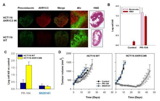 SN35141/SN29176 is not a substrate for AKR1C3 in vivo. (A) Detection of hypoxia (via pimonidazole) and AKR1C3 in a clonal cell line of HCT116 generated to homogeneously overexpress AKR1C3 in xenografts (AKR1C3#6) with representative immunofluorescence. (B) Clonogenic cell kill of PR-104-treated (380 µmol/kg) HCT116 AKR1C3#6 xenografts +/− hyperbaric oxygen (HBO, 100% O2, 32 psi, 2 h). Log cell kill values are relative to normoxic controls. (C) Clonogenic cell kill of HCT116 WT and HCT116 AKR1C3#6 xenografts after treatment with PR-104 at the human equivalent dose (380 µmol/kg) or SN35141 at 75% MTD (1330 µmol/kg). (D) Inhibition of growth of HCT116 WT or HCT116 AKR1C3#6 xenografts by PR-104 or SN35141 monotherapy. Both prodrugs were administered as a single dose of 1330 µmol/kg on day 0.