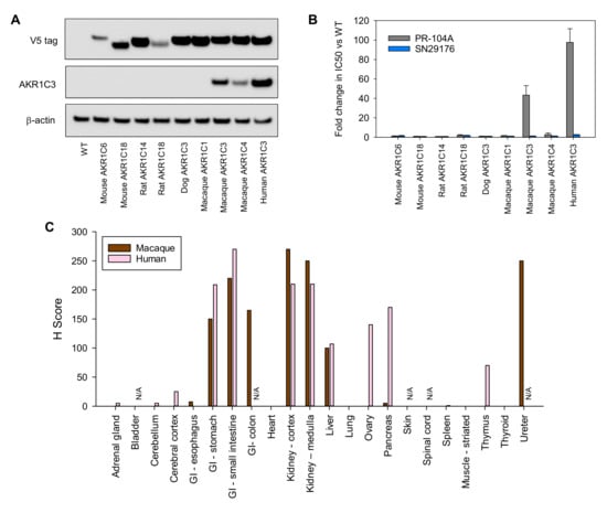 Protein expression was confirmed via an inducible V5 tag (Figure 7A). An antibody selective for AKR1C3 in humans was shown to cross react with macaque AKR1C3 and AKR1C4 (Figure 7A). The sensitivity of these cell lines to PR-104A and SN29176 was then evaluated. Mouse, rat and dog orthologues of AKR1C3 were inactive for both prodrug substrates (for sequence homologies see Supplementary Figure S8). Increases in sensitivity were only observed when cells expressing macaque or human AKR1C3 were exposed to PR-104A. As expected, no increases in sensitivity to SN29176 were observed (Figure 7B). Previously, we evaluated AKR1C3 expression by immunohistochemistry in microarrays consisting of sections of human tumour or normal tissues [16]. Here, we evaluated AKR1C3 expression in a microarray of 22 normal macaque tissue sections using the same high-quality anti-AKR1C3 monoclonal antibody (Figure 7C). Staining intensity and distribution (H-score) of AKR1C3 in macaque tissues was similar to that seen in human tissues with the exception of ovary, pancreas and thymus, which showed lower AKR1C3 expression than observed previously [16] in human tissues (Figure 7C).