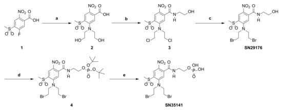 The synthesis of SN29176 from nitrobenzoic acid 1 [39,40] via six synthetic steps has been described by our laboratory in the patent literature [41]. In the present work, a more direct three-step procedure was developed that has also been published in patents [42]. Briefly, diethanolamine displacement of the activated 4-fluoro substituent of 1 provided carboxylic acid 2 (Scheme 1). Thionyl-chloride-mediated trichlorination and subsequent amide coupling of the resultant acid chloride intermediate with 2-aminoethanol then gave the dichloro mustard 3. Chlorine to bromine halogen exchange employing repeat submissions to lithium bromide in 3-methyl-2-butanone at reflux gave SN29176. A further two synthetic steps provided SN35141. Specifically, the 1H-tetrazole-mediated reaction with di-tert-butyl-di-iso-propylphosphoramidite followed by in situ oxidation with meta-chloroperoxybenzoic acid gave the di-tert-butyl phosphate ester 4, which was hydrolysed under acidic conditions to afford the phosphate pre-prodrug SN35141.