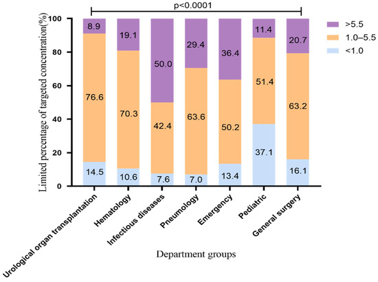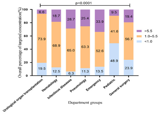 Departments with more than 100 VRZ blood samples were included. A trough concentration between 1.0 and 5.5 μg/mL was considered the ideal target range [51,52]. To analyze the distribution of VRZ concentration and its standard rate, the VRZ concentration was divided into three groups: less than 1 μg/mL, 1–5.5 μg/mL, and >5.5 μg/mL. The proportion of group 1–5.5 μg/mL was considered as the standard rate. Based on the overall standard rate analysis, we limited the VRZ dosing regimen to evaluate the difference of VRZ concentration among different departments and the influencing factors in those departments under the same VRZ dosage. TDM results of samples with a maintenance dose of 200 mg q12h were selected, and the VRZ concentration distribution and standard rates were compared with the results before dose limiting.