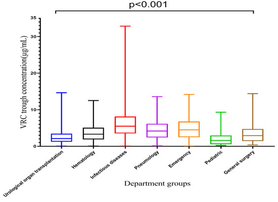 There have been studies of the pharmacokinetics of VRZ in kidney transplant recipients [18], cancer patients [19], and children [20]. Although VRZ is used in many departments, there are no studies on the use of VRZ among departments, specifically concerning differences in VRZ concentration. To address these issues, this study aimed to record VRZ concentrations in several clinical departments to provide a reference regarding its rational use.