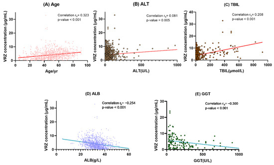 If patient age increased by 1 year, the concentration of VRZ increased by 0.049 μg/mL. VRZ concentration increased by 0.010 μg/mL with one unit increase in TBIL, the concentration tended to be 0.100 μg/mL lower if ALB increased by one unit. With 1 U/L ALT and GGT increases, the concentration increased by 0.007 μg/mL and decreased by 0.004 μg/mL respectively. The linear regression equation was as follows: