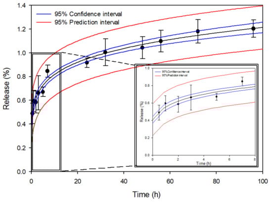 | Korsmeyer-Peppas | M (%) = 0.551 (±0.018) t 0.171 (±0.009) (r = 0.986, SS = 0.020) |