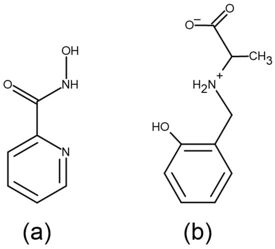 The present study attempts to characterize the biological activities of cobalt(II) systems. Such transition metal complexes provide possibilities of creating new therapeutic products unavailable to organic compounds due to their varied coordination numbers, geometries, redox states and thermodynamic–kinetic characteristics. Cobalt(II), as the central ion of vitamin B12 and an enzyme component, is essential for the normal functioning of living organisms [22]. Due to the emergence of drug resistance related to the platinum chemotherapeutic agents, drugs based on cobalt complexes have shown encouraging results, also supported by low expenditure for the design of new species [23,24]. Chelation affects a distinct change in the biological properties of the ligands and the metal moiety; their presence can cause a range of diseases, including cancer; however, they can also be used to treat them [1]. To obtain biologically active metal complexes, it was advisable to use ligands such as 2-picolinehydroxamic acid (PicHA) and N-(2-hydroxybenzyl)alanine (AlaSal), Figure 1, which are known to demonstrate antibacterial and antifungal properties [25,26].
