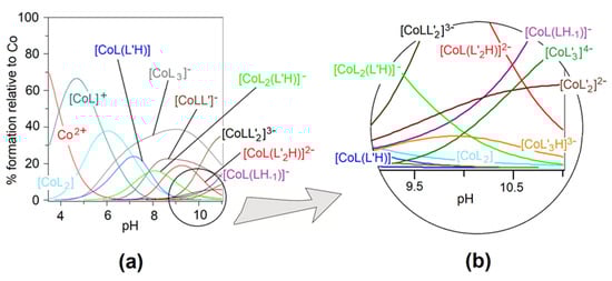 (a) Distribution diagram of species as a function of pH relative to Co(II), for the complexes formed in the Co(II)–PicHA–AlaSal system at PicHA:AlaSal:Co(II) molar ratio 2:2:1, CCo(II) = 5.0 × 10−3 M, (b) extended part of species distribution curves.