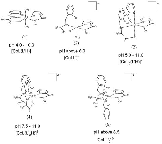 Five heteroligand complexes (Figure 3) were confirmed by potentiometry; the overall stability constants together with the related constants are presented in Table 1. As it can be seen in the speciation diagram (Figure 2), the first heteroligand [CoL(L’H)] complex (1) occurs at pH 4 (Figure 3). The AlaSal with protonated phenolic group most likely coordinates the metal via carboxyl and amine atoms in place of equatorial water molecules of the binary PicHA complex, [CoL]+. This chelation mode has been previously described for an analogous binary X-ray crystal form of hydroxybenzyl derivative [38]. At higher pH values, the equilibrium set comprises a complex with a completely deprotonated AlaSal molecule [CoLL’]− (2) (Figure 3). The deprotonation step of the 1 complex forming 2 occurs according to the equation:
