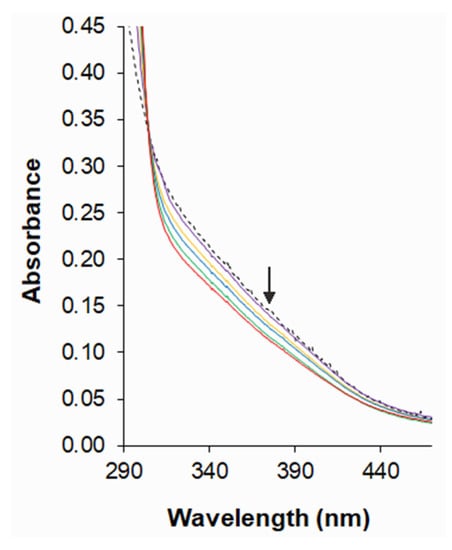 The ability to bind heteroligand cobalt(II) complexes with DNA was determined by the electron absorption method. The spectra indicated that the heteroligand system was stable over the 24 h that the assays were performed (Figure S2). At about 304–440 nm, a decrease of absorbance was observed for subsequent Co(II)–PicHA–AlaSal samples containing increasing concentrations of DNA sodium salt from calf thymus (CT-DNA) (Figure 4). The changes in absorbance suggest that the heteroligand complexes bind to DNA by intercalation, due to the strong stacking interaction between planar aromatic chromophores of the ligands and the DNA base pairs. Such interaction has already been observed for the PicHA binary complexes [25] as well as for other Co(II) structures containing pyridyl groups [48] and reduced Schiff base ligands [49]. The stacking interaction between the π*-orbital of the intercalated ligand and the π-orbital of the DNA base pairs leads to a decrease in the energy levels of the complex, causing the π-π* transitions to decrease, resulting in hypochromism in the absorption spectra [50]. The electron-withdrawing effect of the ligand rings can increase the affinity of the complexes to DNA [51]. Moreover, a strongly flattened PicHA conformation favors the formation of the intercalative binding mode [52,53].