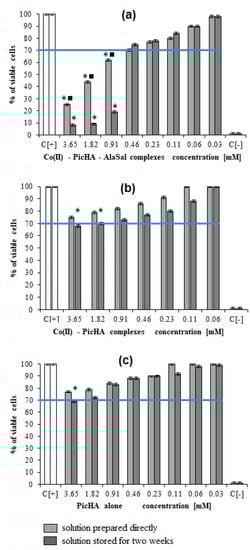 Cytotoxic effect of the studied complex and ligand forms: (a) Co(II)–PicHA–AlaSal, (b) Co(II)–PicHA and (c) PicHA towards mouse fibroblasts L929. The cytotoxicity was assessed by 3-(4,5-dimethylthiazol-2-yl)-2,5-diphenyltetrazolium bromide (MTT) reduction assay. The cell viability was calculated for four experiments including three repeats for each compound. Complete RMPI-1640 medium (cRPMI) was used as a positive control (C+) of cell viability (100% viable cells) and 0.03% H2O2 as a negative control (C−) of cell viability (100% dead inactive cells). Statistical significance: * ■ p < 0.05; * untreated cells vs. cells treated with tested solution (solution prepared directly or solution stored for two weeks); ■ solution prepared directly vs. solution stored. The blue line indicates the minimal percentage of viable cells (70%) required to confirm the compound as noncytotoxic at the in vitro level. Data are presented as mean values ± SD.