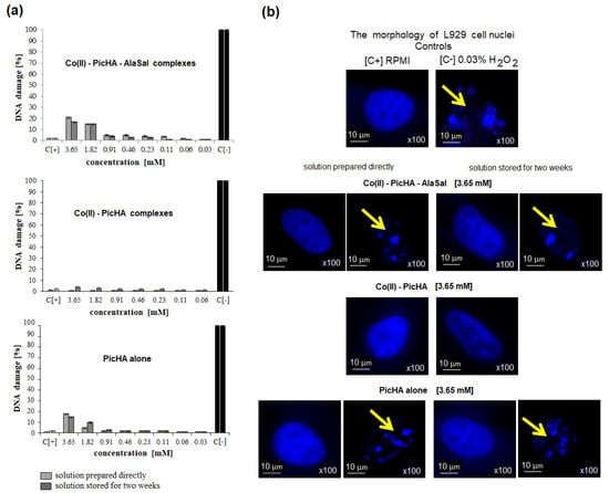In cell cultures exposed to 1.82–3.65 mM Co(II)–PicHA–AlaSal complexes or PicHA alone, freshly prepared or stored, approximately 20% of the cells showed a tendency to cell nuclei vesication (Figure 6a) compared to unexposed controls; however, this difference was not statistically significant. In the presence of Co(II)–PicHA, the cell nuclei remained almost unchanged in the entire cell population (Figure 6a).
