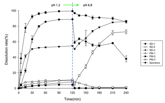 Drug release behaviors of SDs, PMs, and Sporanox® in pH-shift dissolution medium (n = 6).