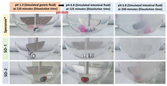 Visual observation of the release behaviors of the ITZ formulations (Sporanox®, SD-1, and SD-2) in the pH-shifting method.