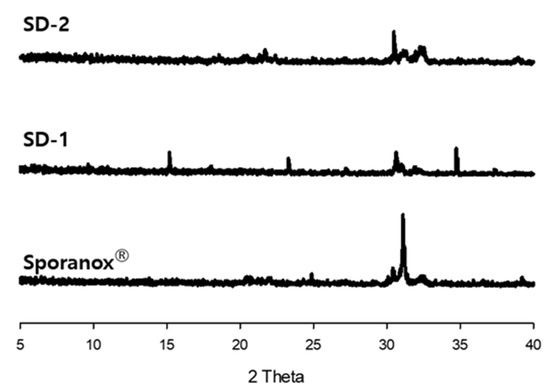 After the dissolution test, the dissolution medium that contained SD-1, SD-2, and Sporanox® was passed through a 200-mesh sieve (75 µm) and transferred to a beaker. It was dried at 60 °C until the medium evaporated. The XRD patterns of ITZ in SDs and Sporanox® were evaluated to understand the recrystallization behavior of ITZ upon changing the pH of the dissolution medium.