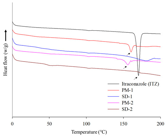 DSC thermograms of itraconazole (ITZ), PM-1, SD-1, PM-2, and SD-2.