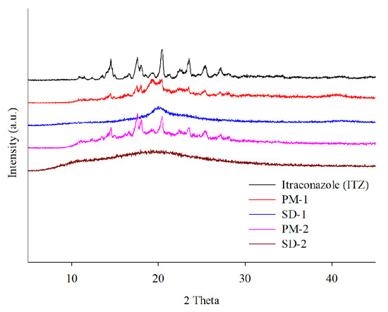 X-ray diffraction patterns of itraconazole (ITZ), PM-1, SD-1, PM-2, and SD-2.