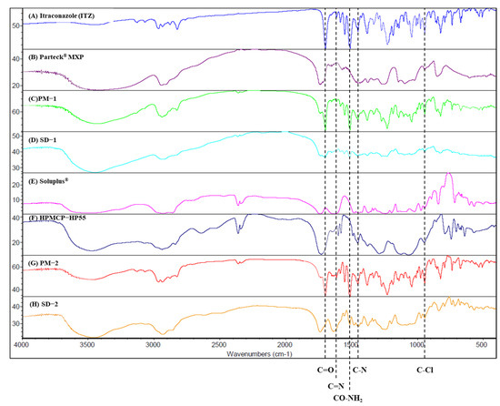 FT-IR spectra of: (A) itraconazole, (B) Parteck MXP, (C) PM-1, (D) SD-1, (E) Soluplus®, (F) HPMCP-HP55, (G) PM-2, and (H) SD-2.
