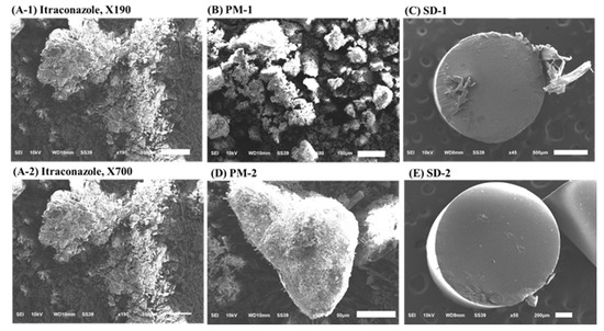 Scanning electron microscopy (SEM) images of: (A-1) itraconazole (ITZ) (190× magnification), (A-2) itraconazole (ITZ) (700× magnification), (B) PM-1, (C) SD-1, (D) PM-2, and (E) SD-2.