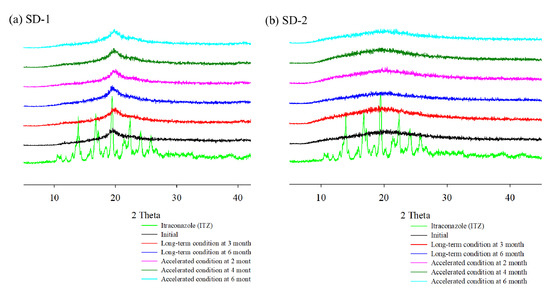 Table 1 and Figure 8 show that there were no significant changes in the drug content and dissolution rates for the SD-1 and SD-2 formulations under long-term (25 ± 2 °C, 60% ± 5% RH) and accelerated (40 ± 2 °C, 75% ± 5% RH) storage conditions. There were no significant differences in the drug content or release behavior of ITZ between the initial stage of the SD and its condition after 6 months. In addition, PXRD analysis was performed to evaluate the changes in the crystal form during the stability test (Figure 9). Diffraction peaks of the crystalline ITZ in SD-1 and SD-2 did not appear under both storage conditions, confirming the stability of the SDs that were prepared using HME.