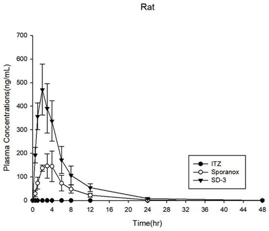 An in vivo rat model assessment was used to investigate the absorption behavior of ITZ. Three test groups were administered to rats: SD-3 (50% SD-1 and 50% SD-2 pellets), ITZ crystalline powder, and Sporanox®. ITZ crystalline powder and Sporanox® (ITZ 100 mg, Janssen) were used as reference formulations. The mean weight of the 18 rats (male Sprague–Dawley rats) was 276.46 ± 8.51 g. The rats were divided into three groups of six rats each. SD-3 pellets, Sporanox®, and ITZ crystalline powder were milled with a mortar and pestle and suspended in purified water that contained citric acid and xanthan gum. Each ITZ formulation was administered to the rats after a 16 h fast. The feeding resumed 4 h after the administration of ITZ. The rats in all of the groups were administered 20 mg/kg of ITZ. Blood samples (300 μL each) were collected from the jugular vein at 0, 0.5, 1, 2, 3, 4, 6, 8, 12, 24, and 48 h after drug administration and stored in 15 µL heparin-treated 1.5 mL microtubes. The blood samples were centrifuged at 1200 rpm/4 °C for 3 min. After centrifugation, more than 100 μL of the supernatant (plasma) was transferred to a microtube. The plasma samples were then stored at below −70 °C in a deep freezer before quantitative analysis. These animal experiments were performed following the protocol reviewed and approved by the Animal Experimental Ethics Committee of the Korea Preclinical Center (KPC-E2019035).