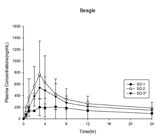 The SD-1, SD-2, and SD-3 capsules were prepared and administered to beagle dogs. The results of the in vivo analysis performed in beagle dogs are shown in Figure 11 and Table 3. The AUC0–24h of SD-1 was 3.37 ± 3.28 μg·h·mL−1, and that of SD-2 was 7.50 ± 4.50 μg·h·mL−1, indicating that the AUC0–24h of SD-2 was 2.2 times higher than that of SD-1 in the beagle dog model. The dissolution rate of SD-1 was significantly higher than that of SD-2 at pH 1.2. The ITZ in the SD-1 formulation was dispersed only in the PVA-based Parteck® MXP. The solubility of ITZ in a binary SD system is easily affected by the external environment, such as the pH of the simulated biological fluid. As a result, the mean plasma concentration of ITZ in SD-1 was lower than that in SD-2.