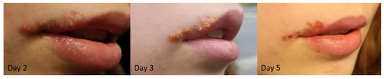 Cold sores develop via several stages characterized by different symptoms (Figure 1). In the first stage, patients may feel tingling, itching, or a burning sensation, but without the blister being formed yet. Next, peri-oral and intra-oral lesions will develop, starting with the vesicular stage (1–2 days after initial symptoms), the opening of the blister(s) (around day 4), and subsequently drying out (day 5–8), leaving a yellow or brown crust, which eventually flakes off. The final stage is the healing, and scabs will become smaller in time until complete healing (normally 7–14 days) [7,10,11]. Effective treatments options are limited and often restrain on antiviral drugs and topical creams, such as acyclovir (Zovirax), famciclovir (Famvir), valacyclovir (Valtrex), docosanol (Abreva), and penciclovir (Denavir) limiting viral DNA replication [7,12]. These treatments may reduce the duration of a cold sore by 0.5 to 2.5 days, depending on the type of medication and dosage used [4,12]. However, these drugs may cause in some cases (1–10%) various side effects, including discouragement, irritability, tiredness, nausea, vomiting, cramps, diarrhea, body aches or pain, rash, itching, and sore throats [13,14,15]. Clinicians also prescribe nonsteroidal anti-inflammatory drugs (NSAIDs) to reduce associated pain [16,17,18,19]. Cold sores are uncomfortable, negatively affect aesthetics, and can be considered embarrassing, creating a psychosocial impact that affects the quality of life of these patients (Figure 1) [8,19]. Novel therapies that have antiviral activity with fewer side effects and decreased wound healing time are eagerly awaited.
