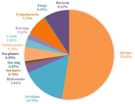 Percentage distribution of 1,3-oxazole-containing alkaloids from marine organisms.