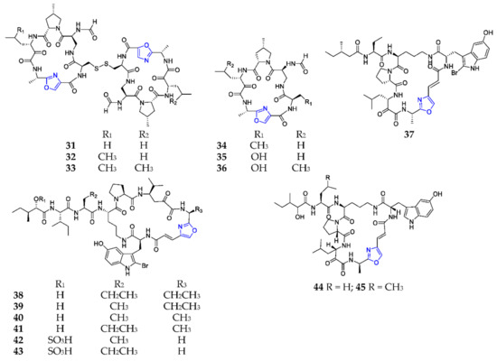 Marine-derived 1,3-oxazole-containing monocyclic pentapeptides (31–45).