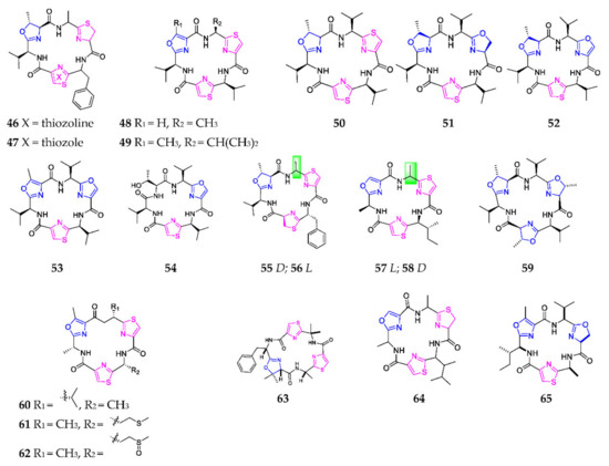 Marine-derived 1,3-oxazole-containing monocyclic hexapeptides (46–65).