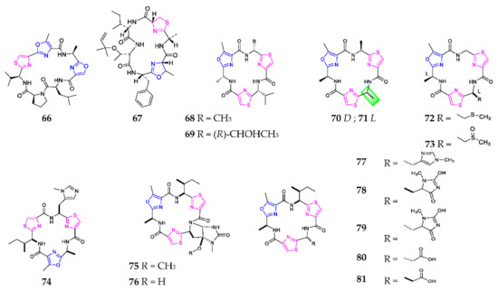 One novel cyclic hexapeptide, comoramide A (67), produced by the ascidian Didemnum molle and collected at Dzaoudzi Mayotte, was found to exhibit mild cytotoxicity against tumor cells A549, HT29 and MEL-28 [52]. Bioassay-guided fractionation of the marine cyanobacterium Oscillatoria sp., collected off Buenaventura Bay, led to the isolation of two antimalarial agents, venturamides A (68) and B (69), which were chemically synthesized using an efficient one-pot method with respective yields of 32.7% and 30.7% [53]. Tenuecyclamides A–D (70–73) were purified from the cyanobacterium N. spongiaeforme var. tenue, of which 70, 72 and 73 had an inhibitory effect on the sea urchin embryos’ division with an ED100 of 10.8, 9.0 and 19.1 µM, respectively [54]. The stereochemistry of 70 and 71 was established through the solid-phase assembly of heterocyclic amino acids in 2004 [55]. Microcyclamides are one class of cyclic hexapeptides formed by the ribosomal pathway [56]. Chemical study of the cyanobacterium Microcystis aeruginosa afforded eight cytotoxic microcyclamide derivatives (74–81) [57,58].