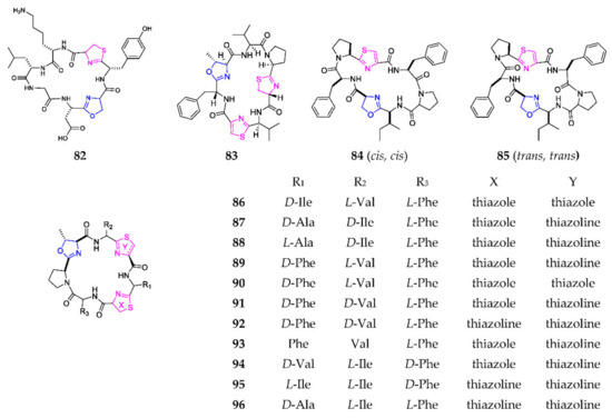 Using the heat shock method, one novel 1,3-oxazole-containing heptapeptide, cyanothecamide C (82) (Scheme 5), was produced by the marine cyanobacteria Cyanothece sp. PCC 7425 at 37° for 24 h [59]. Cyclodidemnamide (83) was derived from the marine ascidian Didemnum molle, collected on the Philippine Islands, and exhibited weak cytotoxicity towards human colon tumor cells [60]. Two isomers, (cis, cis)-ceratospongamide (84) and (trans, trans)-ceratospongamide (85), were obtained from the Indonesian red algae Ceratodictyon spongiosum and symbiotic sponge Sigmadocia symbiotica, of which the latter possessed a potent anti-inflammatory effect with an ED50 value of 32 nM [61]. Chemical investigation of the ascidian Lissoclinum patella resulted in the sequential isolation of 11 cytotoxic heptapeptides, including lissoclinamides (86–95) and ulicyclamide (96) [62,63,64,65,66,67]. SAR analysis indicated that cytotoxic effects of 89, 90 and 92 were obviously reduced if the thiazoline ring was replaced by oxazoline, and that of 92 was significantly increased by replacing oxazoline in the macrocycle with thiazoline [68].