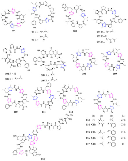 Marine-derived 1,3-oxazole-containing monocyclic octapeptides (97–118).