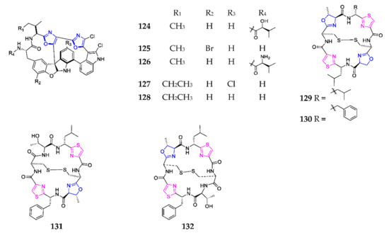 Marine-derived 1,3-oxazole-containing bicyclic peptides (124–132).