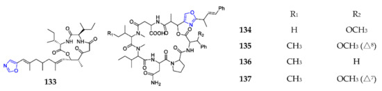 Marine-derived 1,3-oxazole-containing depsipeptides (133–137).