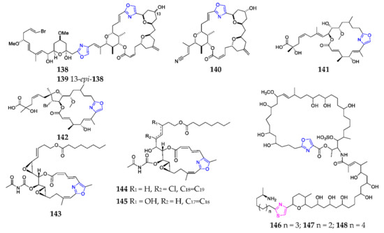Marine-derived endocyclic mono-oxazole macrolides (138–148).